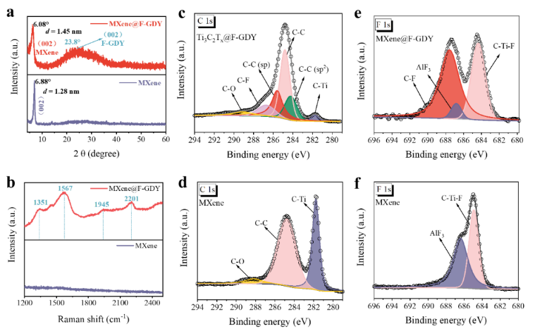 图3. MXene@F-GDY异质结构与纯MXene的(a) XRD与(b) 拉曼谱图,(c-f) MXene@F-GDY异质结构与纯MXene的XPS谱图。