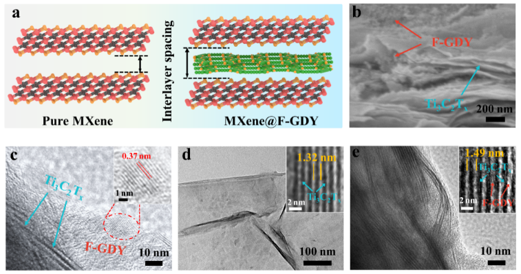 图2. (a) MXene@F-GDY异质结构与纯MXene的层间距差异示意图,(b) MXene@F-GDY的SEM图;(c) MXene@F-GDY,(d) 纯MXene,(e) MXene@F-GDY的HRTEM图。