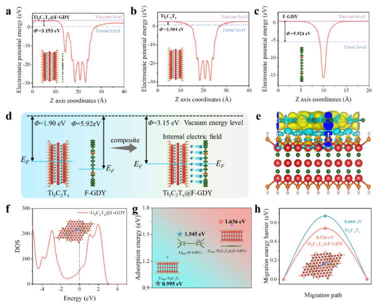 图4. (a-c) MXene@F-GDY,纯MXene,纯F-GDY的功函;(d)电子转移和内建电场形成示意图;(e)异质结构界面处的电荷密度差;(f)MXene@F-GDY的DOS图;(g)锂离子吸附能;(h)锂离子在表面的迁移势垒。
