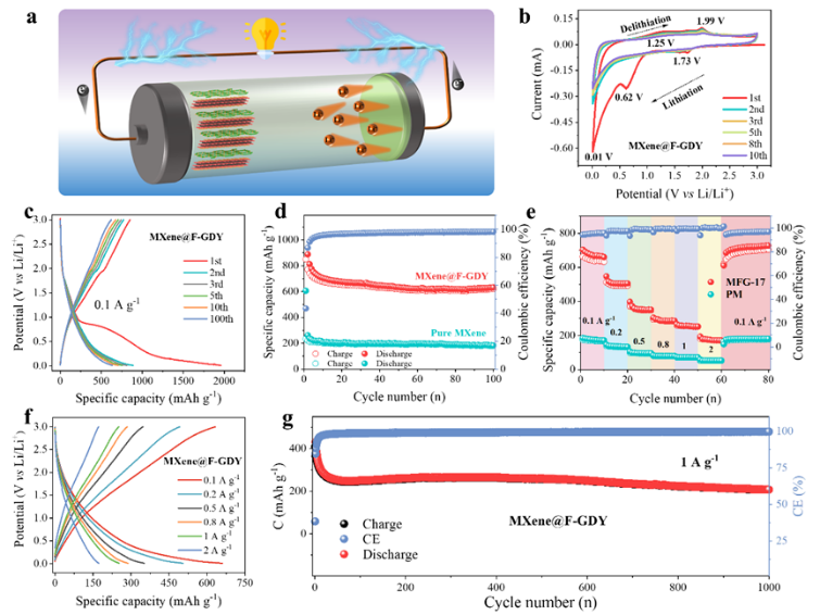 图5. MXene@F-GDY的电化学性能:(a) MXene@F-GDY锂离子半电池示意图,(b) CV曲线,(c) 0.1 A g-1下恒流充放电曲线,(d) 0.1 A g-1下循环稳定性,(e) 倍率性能,(f) 不同电流密度下充放电曲线,(g) 长循环稳定性。