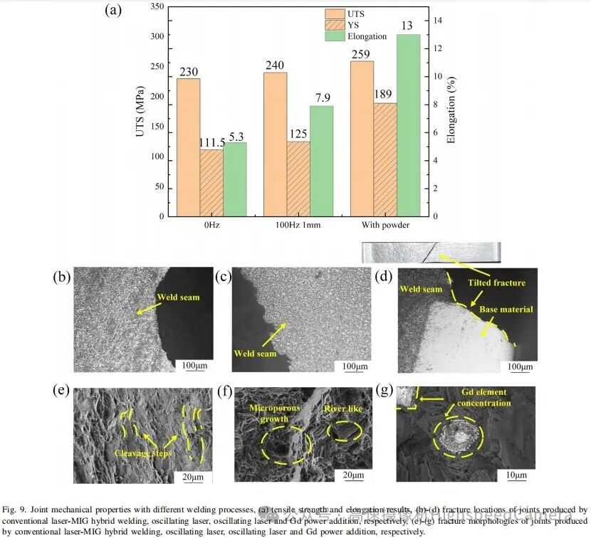 ►取得了突破性的力学性能改善。与常规激光-MIG焊接相比,接头延展率提升了145.3%,达到13%,并且拉伸断裂位置从焊缝转移至母材,表明焊缝性能已优于或等同于母材。