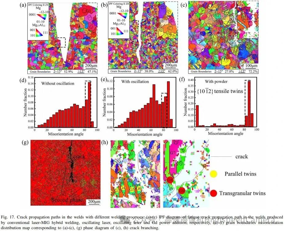 ►详细分析了裂纹在经Gd改性和激光振荡处理后的焊缝中的扩展行为,为理解镁合金焊接接头的疲劳和断裂性能提供了重要见解。