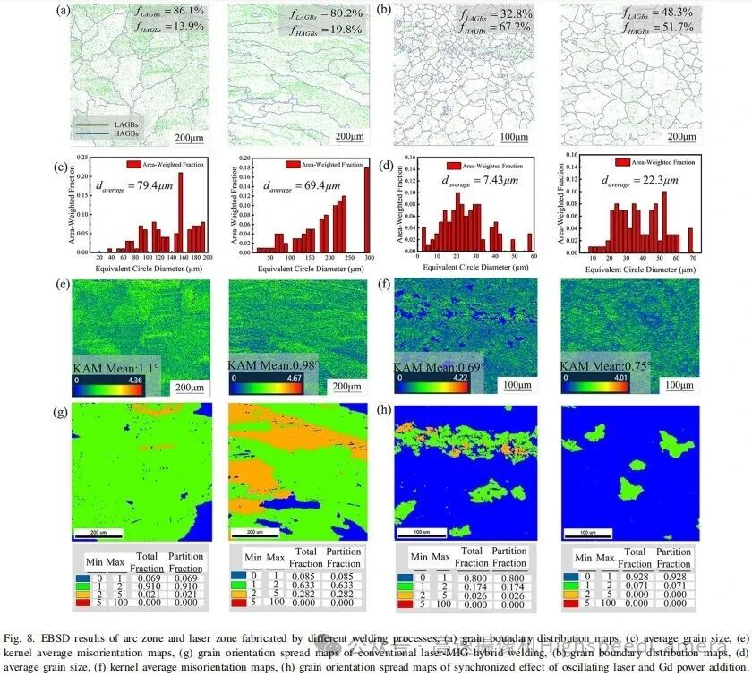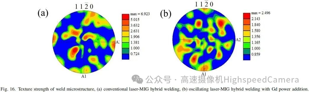 【3】在振荡激光和钆粉的协同作用下,晶粒显著细化,增加了晶界数量,并为孪晶提供了更多的形核核心。同时,由于均匀化的焊缝微观结构诱导了随机化的晶粒取向,焊缝的塑性各向异性降低。