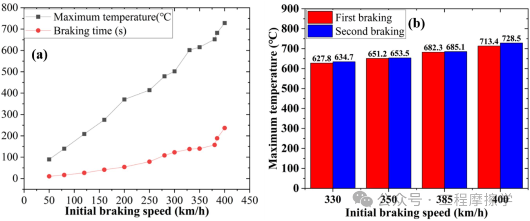 图11:不同初始速度下单次和连续制动的最高温度和制动时间:(a)速度在50至400 km/h范围内的单次制动的最高温度和制动时间,(b)速度在330至400 km/h的范围内的连续制动的最大温度和制动时间
