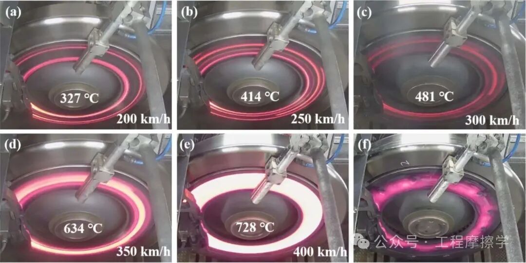 图12:制动测试期间不同初始速度下制动盘的摩擦表面形态:(a)200 km/h,(b)250 km/h,(c)300 km/h,(d)350 km/h,(e)400 km/h,(f)制动停止在400 km/h后制动盘的制动表面状况