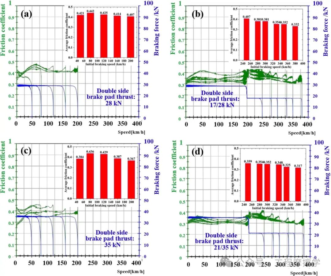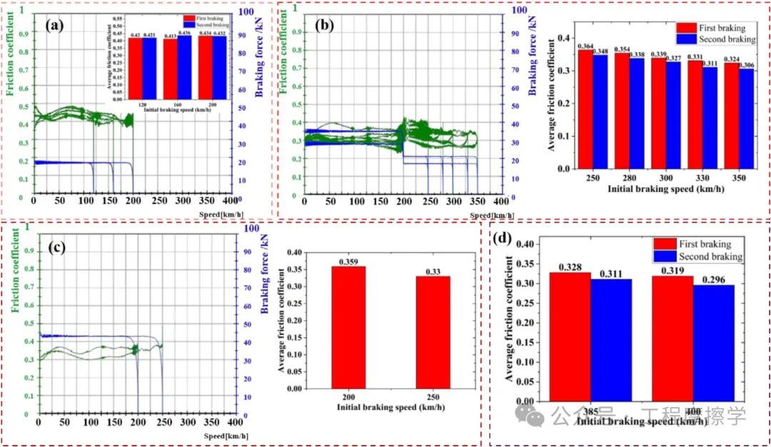 图10:在不同速度下,在干燥和潮湿条件下连续两个循环制动:(a)120 km/h至200 km/h(干燥),(b)250 km/h至380 km/h(干燥),(c)200 km/h和250 km/h(潮湿),(d)3850 km/h和400 km/h(干燥)