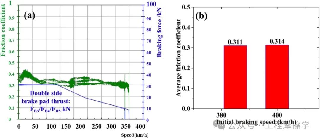 图9:385–400 km/h速度下的补充试验:(a)摩擦系数曲线,(b)平均摩擦系数