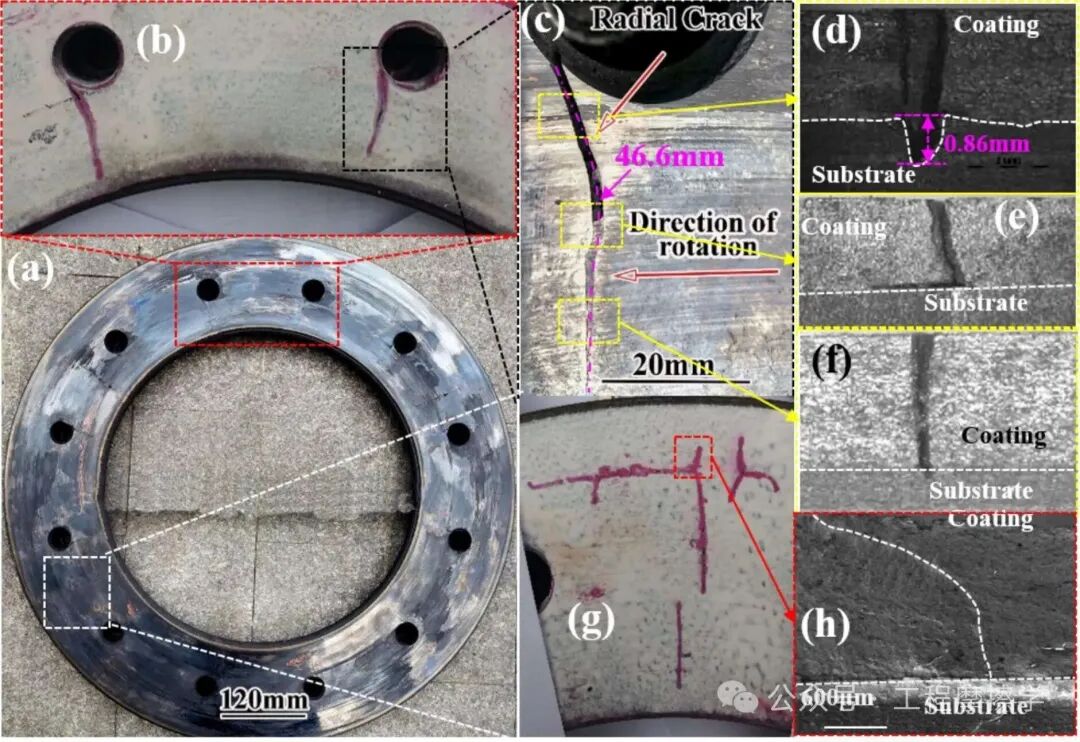 4.减少热疲劳裂纹:制动过程中的循环交变热应力是微裂纹萌生和扩展的主要驱动因素,在螺栓孔周围形成热疲劳裂纹。此外,制动盘上的涂层显著提高了摩擦表面的制动性能,与铸钢制动盘相比,摩擦表面上的周向、径向和网络裂纹明显减少。