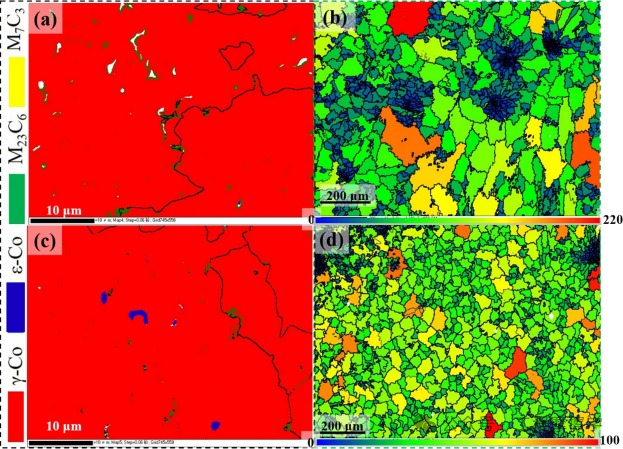 图15:EBSD测试结果涂层前后制动测功机测试的相位和粒度:(a)测试前涂层的相位,(b)测试前的粒度,(c)测试后涂层的相位。(d)测试后的粒度