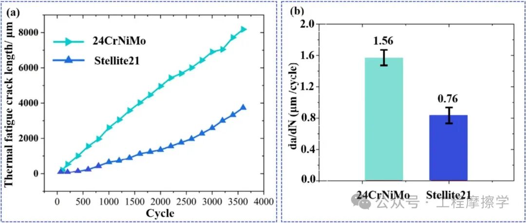 图22:热疲劳性能测试:(a)热疲劳裂纹扩展曲线,(b)热疲劳疲劳裂纹扩展速率