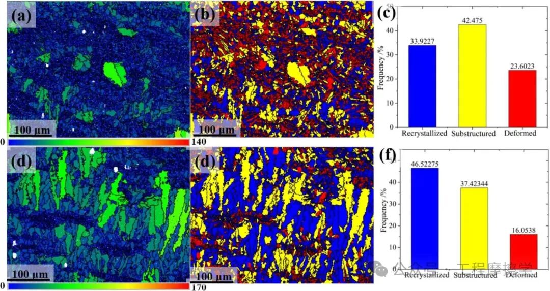 图16:LC盘涂层顶部和底部晶粒尺寸、再结晶亚结构和变形的EBSD测试:(a)涂层顶层晶粒尺寸,(b-c)涂层顶层颗粒再结晶、亚结构和形变测试,(d)涂层底层晶粒尺寸