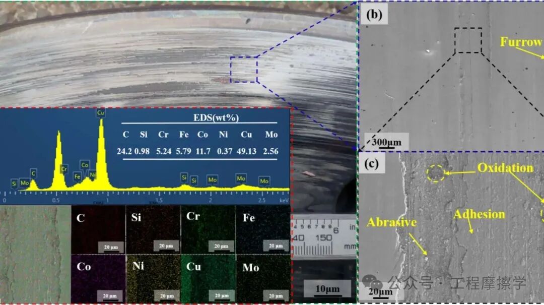 图21:LC-DISC摩擦表面形貌:(a)低功率摩擦表面形貌,(b)图(a)局部放大摩擦形貌,(c)图(b)局部放大的摩擦形貌