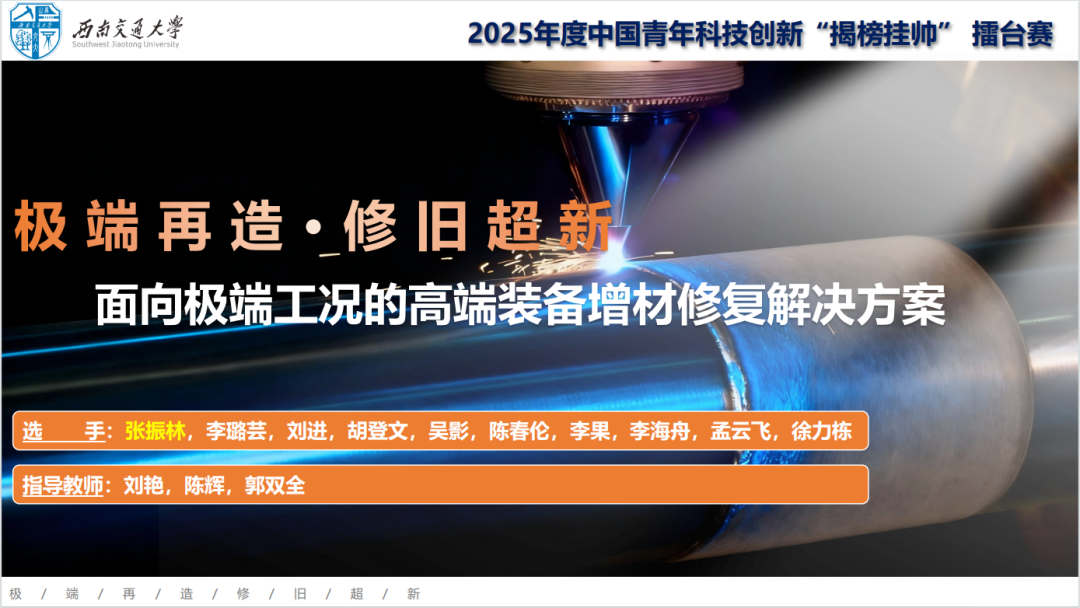 2025年10月14日,2025年度中国青年科技创新“揭榜挂帅”擂台赛“高端装备领域”终审主擂台赛在湖南长沙圆满落幕。在学校校团委的指导下,材料科学与工程学院青年教师张振林等老师的作品“极端再造,修旧超新——面向极端工况的高端装备增材修复解决方案”在众多参赛作品中脱颖而出,代表学校斩获青年科技人才赛道特等奖,这是学校在“挑战杯”这一全国顶级科创赛事“揭榜挂帅”赛道上,首次斩获特等奖,实现了这项荣誉的“零突破”,以硬核科创实力诠释“青春为中国式现代化挺膺担当”的赛事主题。