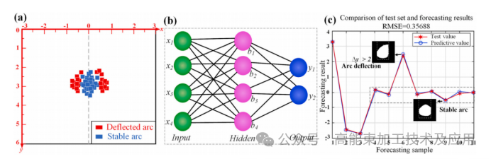 图2.熔滴和电弧位置坐标的预测:(a)熔滴位置坐标的统计;(b)BP神经网络结构;(c)训练模型的准确性。
