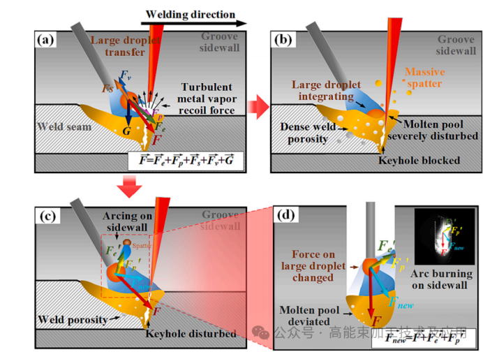 图3.焊缝气孔形成机理示意图:(a)大熔滴受力分布;(b)大熔滴过渡至熔池;(c)侧壁起弧与飞溅;(d)电弧偏转后大熔滴受力情况。