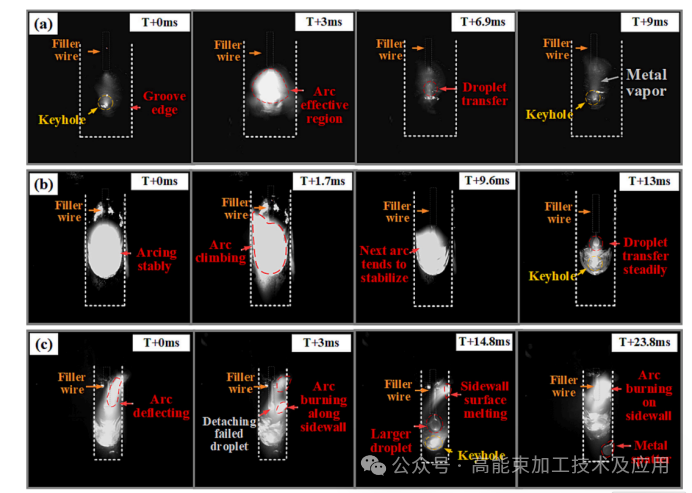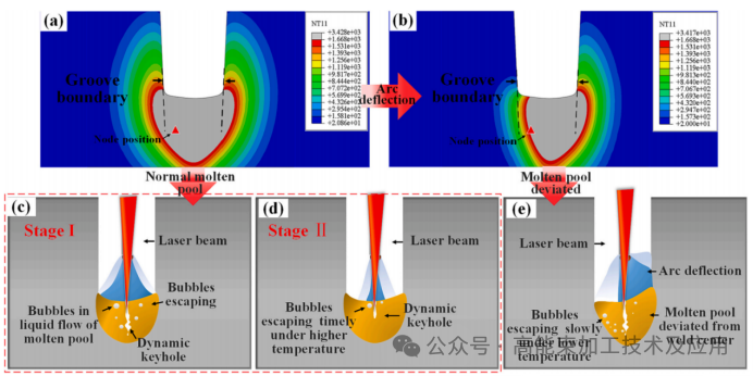 图4.窄间隙激光-电弧复合焊中熔池温度变化:(a)稳定焊接过程的温度分布;(b)电弧偏转后偏移熔池的温度分布;(c-d)气泡在稳定焊接过程中逸出;(e)电弧偏转减缓了气泡逸出速率。