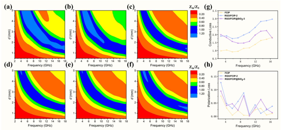 图6:(a) FCIP, (b) RGO/FCIP-2, (c) RGO/FCIP@SiO₂-1, (d) RGO/FCIP@SiO₂-2, (e) RGO/FCIP@SiO₂-3, (f) RGO/FCIP@SiO₂-4 的 |Zin/Z0| 值二维计算阻抗匹配分布图、(g) 电导损耗、(h) 极化损耗。