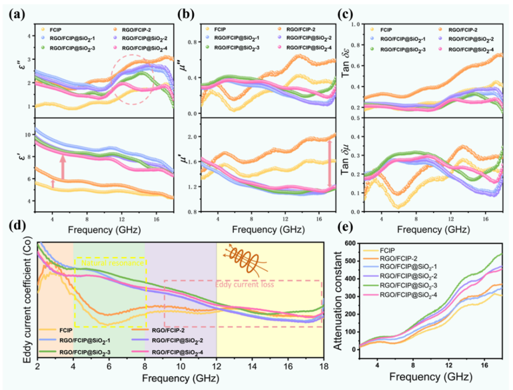 图4:FCIP、RGO/FCIP 和 RGO/FCIP@SiO₂的电磁波吸收性能。(a) 复介电常数 (ε) 的实部 (ε′) 和虚部 (ε′′)、(b) 磁导率 (μ) 的实部 (μ′) 和虚部 (μ′′)、(c) 介电损耗正切 (tanε)和磁损耗正切 (tanδμ)、(d) C0 值、(e) 衰减常数 (α) 的频率依赖性。