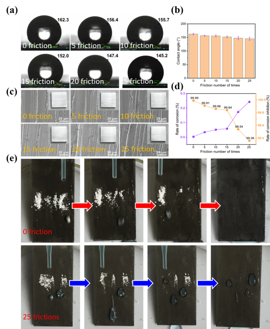 图7:(a) RGO/FCIP@SiO₂-3 涂层在不同摩擦次数下的表面接触角。(b) 接触角误差、(c) 受保护钢板的表面状况和SEM图像、(d) 腐蚀速率和缓蚀效率、(e) RGO/FCIP@SiO₂ 涂层表面在未摩擦时和经过 25 次摩擦循环后的自清洁性能。