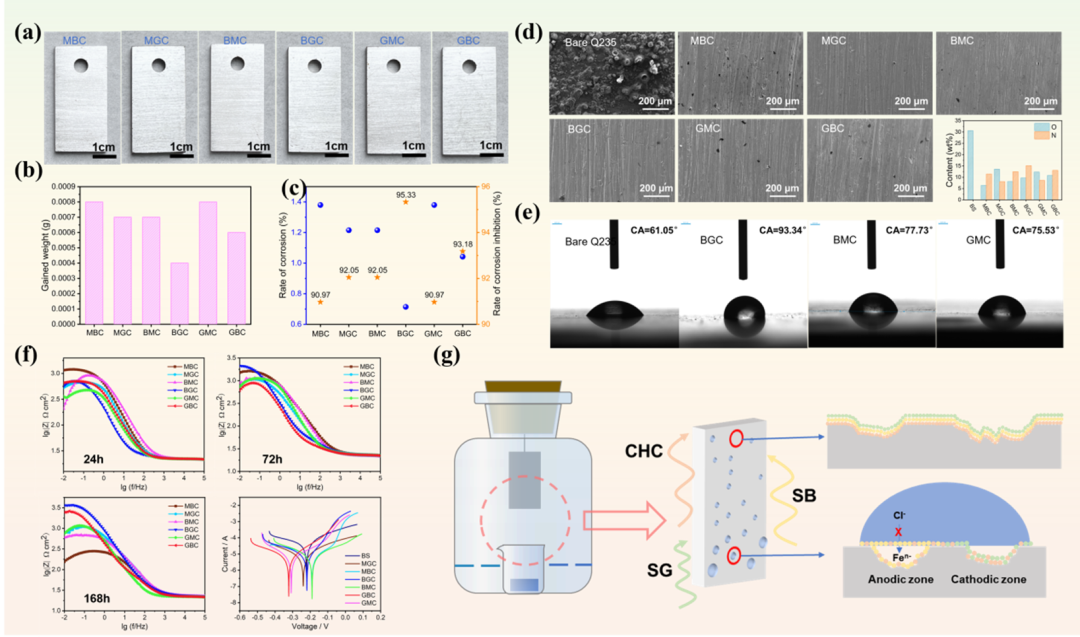 图1:复合气相缓蚀剂(VCI)系统综合评价:(a) 腐蚀测试后钢表面的光学图像、(b) 防护涂层的增重分析、(c) 计算得出的腐蚀速率和缓蚀效率、(d) 钢表面形貌的SEM和EDS表征、(e) 用于评估表面疏水性的水接触角测量、(f) 不同浸泡时间下的电化学阻抗谱(EIS)和塔菲尔(Tafel)极化曲线、(g) BGC 复合体系中协同缓蚀机理示意图。
