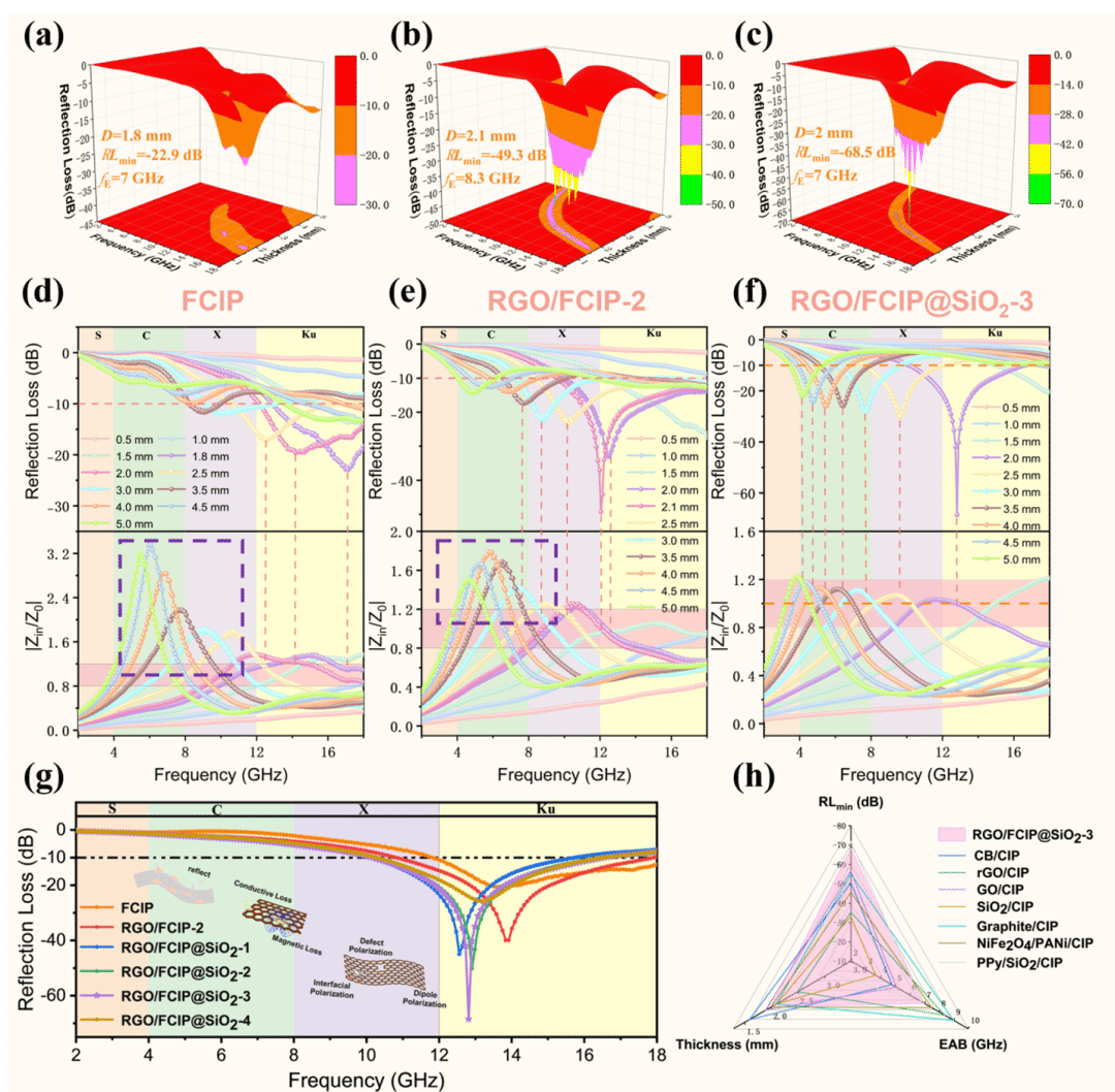 图5:(a) FCIP、(b) RGO/FCIP-2、(c) RGO/FCIP@SiO₂-3 在不同厚度和频率下理论计算的RL值三维分布图、(d) FCIP、(e) RGO/FCIP-2、(f) RGO/FCIP@SiO₂-3 在不同厚度下的RL图及其对应的 |Zin/Z0| 值、(g) 不同样品在 2 mm 厚度下的二维RL图对比、(h) RGO/FCIP@SiO₂-3 的综合性能与已报道的其他 CIP 基吸收剂的比较。
