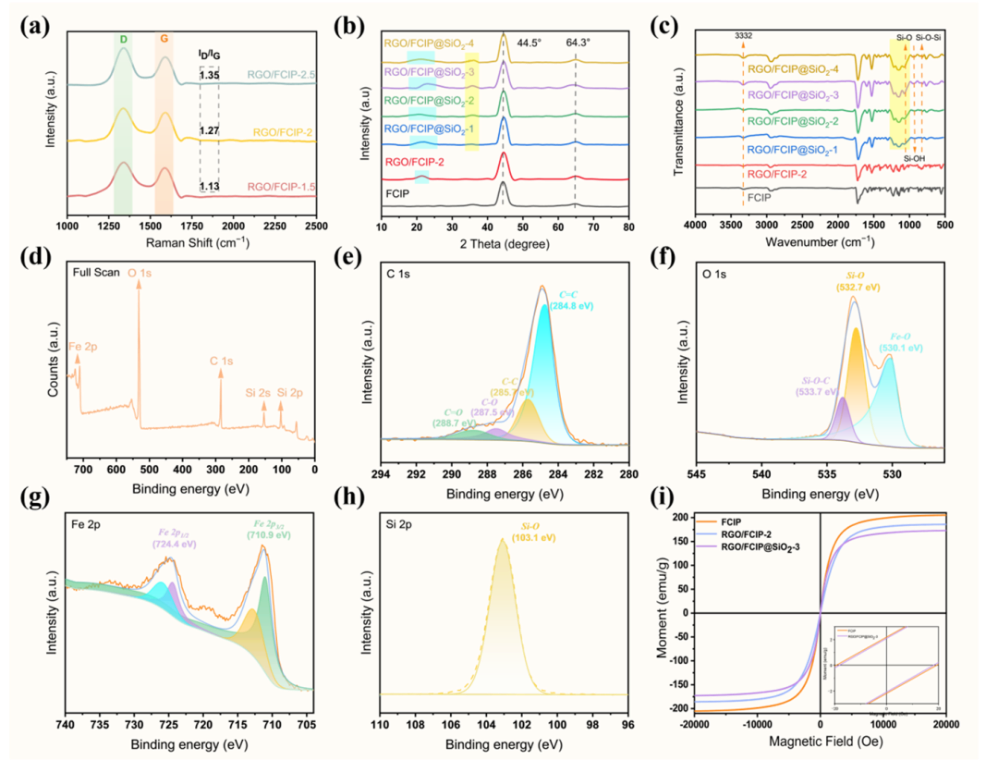 图3:结构与成分表征。(a) Raman图谱、(b)XRD图谱、(c) FT-IR光谱、(d) RGO/FCIP@SiO₂-3 的XPS全谱、 (e) C 1s 谱、(f) O 1s 谱、(g) Fe 2p谱、(h) Si 2p 谱、(i) 磁滞回线。