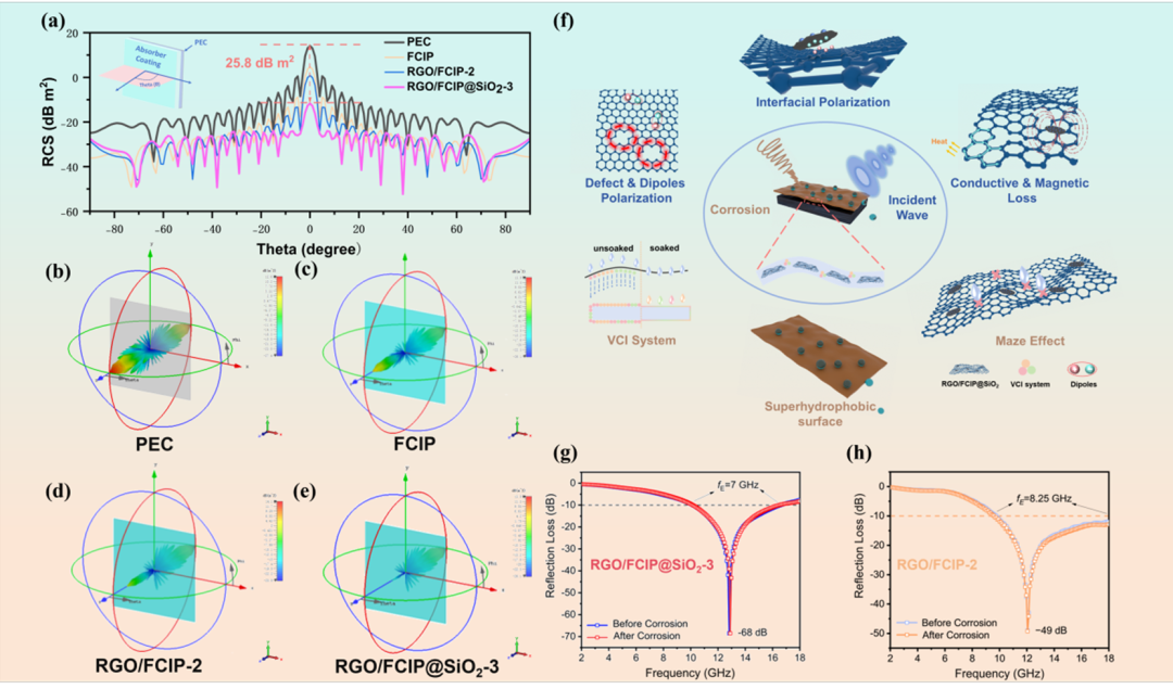 图8:(a) 雷达散射截面 (RCS) 仿真曲线、(b) 理想电导体 (PEC) 以及 (c) 覆盖 FCIP 涂层的 PEC、(d) 覆盖 RGO/FCIP-2 涂层的 PEC 和 (e) 覆盖 RGO/FCIP@SiO₂-3 涂层的 PEC 的仿真结果、(f) RGO/FCIP@SiO₂-3 防腐涂层的吸波与防腐机制示意图、360 小时盐雾测试前后RL值对比: (g) RGO/FCIP@SiO₂-3, (h) RGO/FCIP-2。