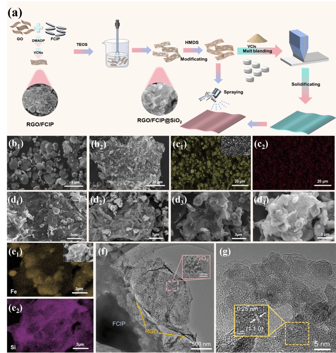 图2:(a) 复合结构及涂层制备工艺示意图、(b1) FCIP、(b2) RGO/FCIP-2 的SEM图像、 RGO/FCIP-2 的元素分布分析: (c1) Fe 元素、(c2) Si 元素、(d1) RGO/FCIP@SiO₂-1、(d2) RGO/FCIP@SiO₂-2、(d3) RGO/FCIP@SiO₂-3、(d4) RGO/FCIP@SiO₂-4 的 SEM 图像、RGO/FCIP@SiO₂-4 的元素分布分析: (e1) Fe 元素、(e2) Si 元素、(f) RGO/FCIP@SiO₂-3 的透射电子显微镜(TEM)图像、(g) RGO/FCIP@SiO₂-3 的TEM图像。