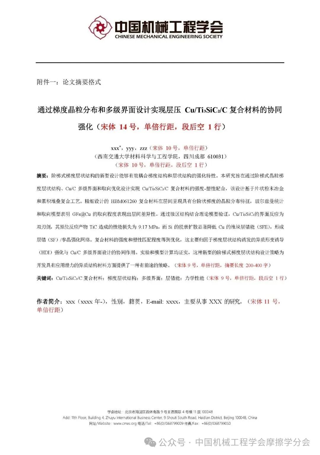会议论文内容符合(但不限于)如下方向:摩擦、耐磨和减摩材料与技术;涂层、表面技术与表面/界面摩擦学;先进轨道交通材料与成型加工工艺;其它轨道交通新材料/新工艺等方面。摘要的提交延长至 2025 年 11 月 10 日,参会者请按附件 1 格式向会议官方邮箱(cdmc_2025@126.com)提交论文题目及摘要。录用论文以口头报告或墙报形式进行发表展示。