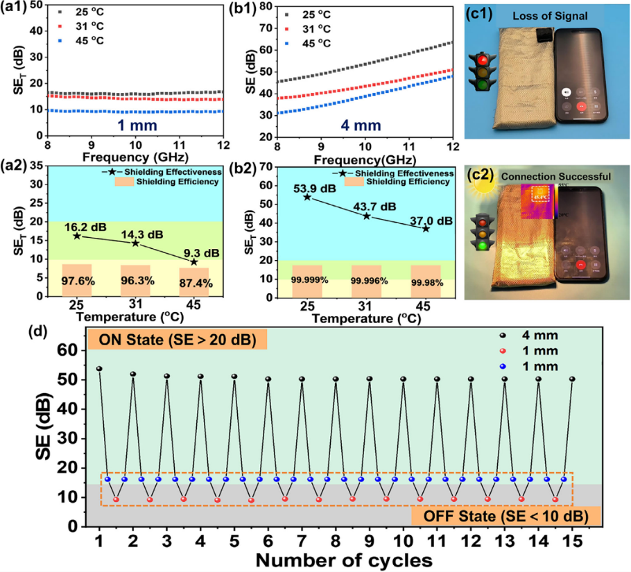 图5. a,b)PMCP-2水凝胶在不同厚度下的可调SET和屏蔽效率。c)具有屏蔽能力的移动的电话,可进行可逆的开/关切换。d)15次循环的可逆EMI屏蔽性能。
