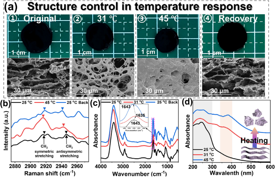 图2. PMCP水凝胶的动态调节:a)不同温度下水凝胶的光学照片和横截面的SEM图像。b)温度依赖性拉曼光谱。c)变温FT-IR光谱。d)不同温度下的原位紫外-可见吸收光谱和相应的机理图示。