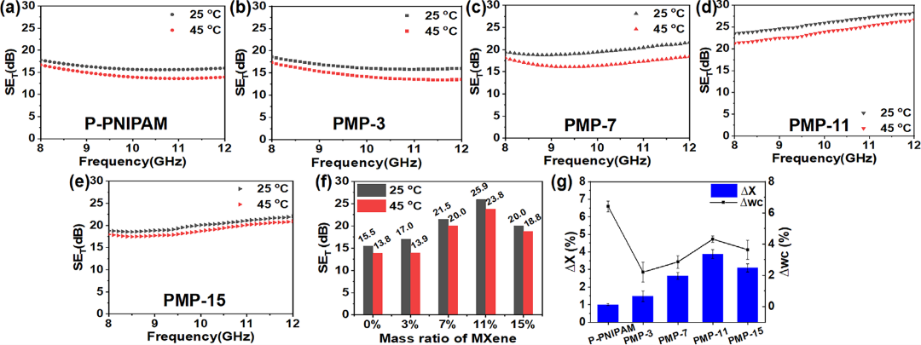 图3. 不同温度下a-f)PMP-x(x代表MXene的质量分数,x=0、3、7、11、15)的可调SET。g)凝胶的屏蔽率(ΔX)与含水量变化(Δwc)的关系。