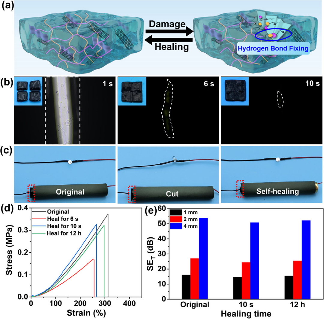 图6. a)氢键介导的PMCP-2水凝胶的动态破坏和重构机制。b)受损PMCP-2的数码照片和显微镜图像。c)PMCP-2水凝胶在具有LED的电路中的自愈过程的快照。d)PMCP-2的拉伸应力-应变曲线。e)EMI屏蔽有效性PMCP-2的EMI SE在不同时间愈合。