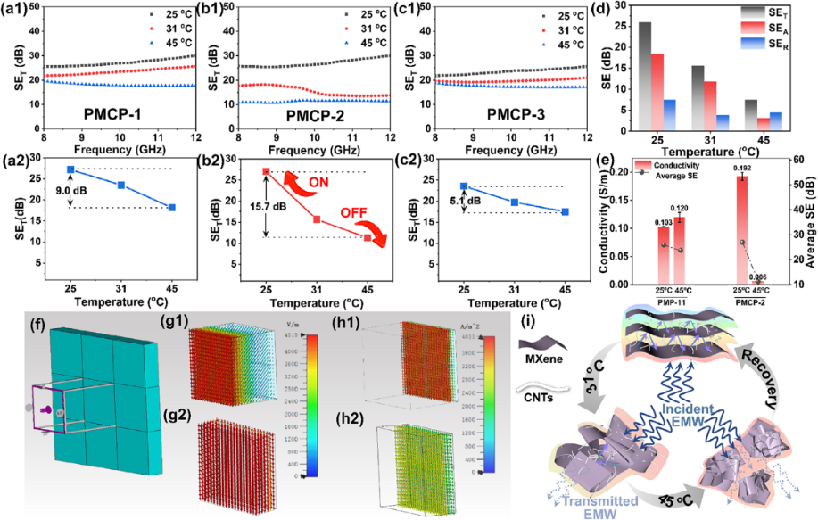 图4. 可调EMI屏蔽性能和相关机制。a-c)2mm厚PMCP水凝胶在不同温度下的总屏蔽效率(SET)。d)PMCP-2的SET、吸收屏蔽效率(SEA)和反射屏蔽效率(SER)。e)PMP-11和PMCP-2水凝胶的电导率变化。f)PMCP-2水凝胶的电磁模拟模型,(g1)25°C和(g2)45°C下的电场分布,(h1)25°C和(h2)45°C下的表面电流密度。i)可调屏蔽性能的示意图。