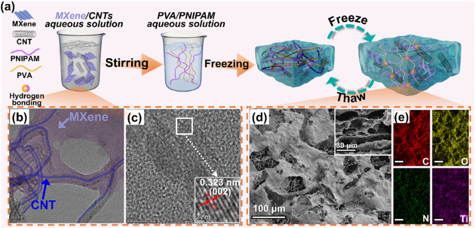 本文制备了一种温度响应型相变水凝胶。通过精确控制材料配比,将MXene与长碳纳米管结合,在PVA和PNIPAM互穿的温敏水凝胶中形成热阻网络。水凝胶具有可调节的屏蔽性能,可以通过改变厚度来调节。此外,它还可以根据环境变化开启/关闭可切换的电磁干扰屏蔽。在厚度为1mm时,水凝胶的电磁干扰屏蔽效能(EMI SE)从16.2dB下降到9.3dB。在厚度为2mm时,EMI SE从27.0下降到11.3dB。此外,在厚度为4mm时,EMI SE从53.9dB下降到37.0dB。由于互穿的聚合物网络促进了可逆的氢键,以及MXene和CNTs之间的粘合相互作用,水凝胶具有显著的自愈性能。愈合后的水凝胶保持了52.1dB的高EMI SE,愈合效率为96.7%。电磁干扰屏蔽开关为制造各种领域的电磁干扰屏蔽材料提供了一种创新策略,例如无线通信,智能可穿戴设备和自修复电子系统,其中动态和自适应电磁屏蔽至关重要。
