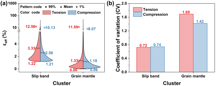 图3 应变分配的拉压不对称性(TCA):(a) 滑移带(SB)与晶界附近(GM)在拉伸和压缩状态下εeff的统计分布;(b) εeff的变异系数(CV,标准差/平均值),该系数是变形不均匀性的评价指标。本图展示了应变分配的TCA,即拉伸状态下的应变局域化程度高于压缩状态。并且,与压缩相比,拉伸状态下GM的变形具有更显著的不均匀性。