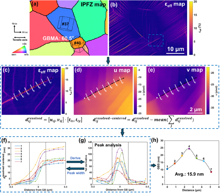 图5 晶界滑动(GBS)定量分析示例:(a) IPF-Z图;(b) εeff分布图;(c)-(e) 晶界的局部放大变形场分布图,分别对应εeff、水平位移场(u)和垂直位移场(v)。图中黑线与白线分别表示晶界段及其对应的中垂线;(f) 中垂线上各点的中心化切向位移;(g) 相应的一阶导数曲线;(h) GBS位移分布曲线。