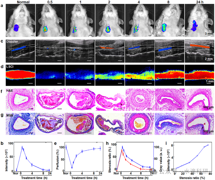 在大鼠颈动脉血栓模型中,SiF@MnL/C6-C NPs通过静脉注射后迅速积累在血栓部位,并发出强烈的荧光信号,实现了血栓的实时成像。多普勒超声和激光散斑对比成像(LSCI)监测显示,SiF@MnL/C6-C NPs治疗显著恢复了血流,24小时内血流速度恢复至正常水平的94.6%,血栓狭窄率降低至7.16%。