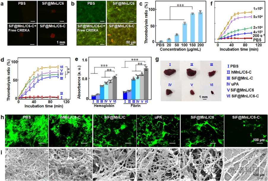 图5、SiF@MnL/C6-C NPs的体外血栓靶向和溶栓。(a) 与SiF@MnL/C6、SiF@MnL/C6-C和SiF@MnL/C6-C+Free CREKA孵育后纤维蛋白的发光图像和(b)荧光共定位。(c) 不同浓度下SiF@MnL/C6-C NPs的溶栓率。(d) 溶栓率和(e) 血块中血红蛋白和纤维蛋白释放的吸光度变化。(f) 不同剪切速率下SiF@MnL/C6-C NPs的溶栓率。(g-i) 不同处理后FITC标记的纤维蛋白血块的血块、CLSM和SEM图像。