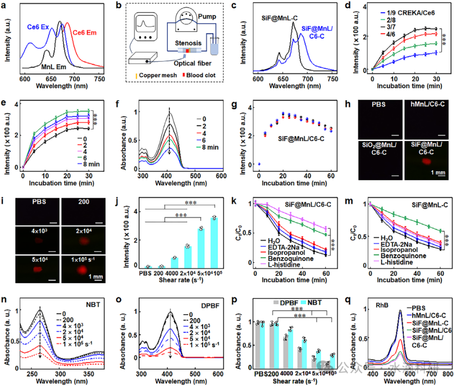 图2、SiF@MnL/C6-C NPs的发光和摩擦催化性能。(a) Ce6和MnL NPs的激发和发射光谱。(b) 用于评估剪切应力诱导的发光和ROS生成的闭环流动系统示意图。(c) SiF@MnL/C6-C处理后血块的时序发光。(d) 不同剪切速率下血块的发光图像。(e) 通过DPBF分解定量ROS生成。(f) 蚀刻时间对ROS生成的影响。(g-i) 剪切应力依赖的发光和ROS生成。(j) 剪切应力依赖的发光强度定量分析。(k) 通过清除实验确定的主要氧化物种。(l-m) ROS生成机制。(n-o) 不同剪切速率下NBT和DPBF的降解。(p) NBT和DPBF降解的定量分析。