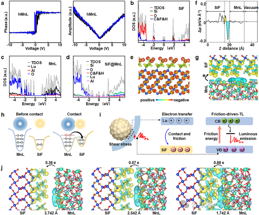 图3、SiF@MnL/C6-C NPs的TL机制。(a) hMnL NPs的PFM相位和振幅。(b-d) SiF、MnL和SiF@MnL的DOS。(e) SiF的ESP。(f) SiF@MnL的平面平均电荷密度差和(g)差分电荷密度图。(h) 接触电致发光机制和(i) 接触诱导的TL机制。(j) 不同距离下SiF与MnL之间的Bader电荷。