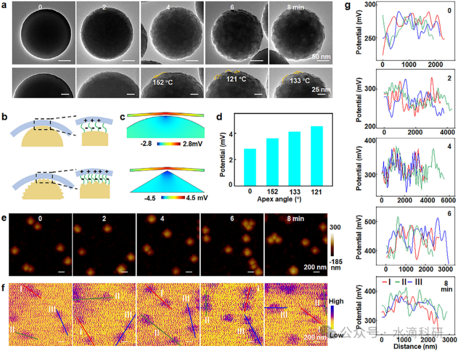 图4、表面粗糙度对接触电致发光的影响。(a) 蚀刻后SiF核的TEM图像和顶角。(b) 粗糙SiF表面增强电子转移的示意图。(c) 光滑和高曲率表面SiF核的电位模拟图像。(d) 不同顶角下SiF表面的电位值模拟。(e-g) 蚀刻后SiF核的地形图、KPFM图像和表面电位分布。