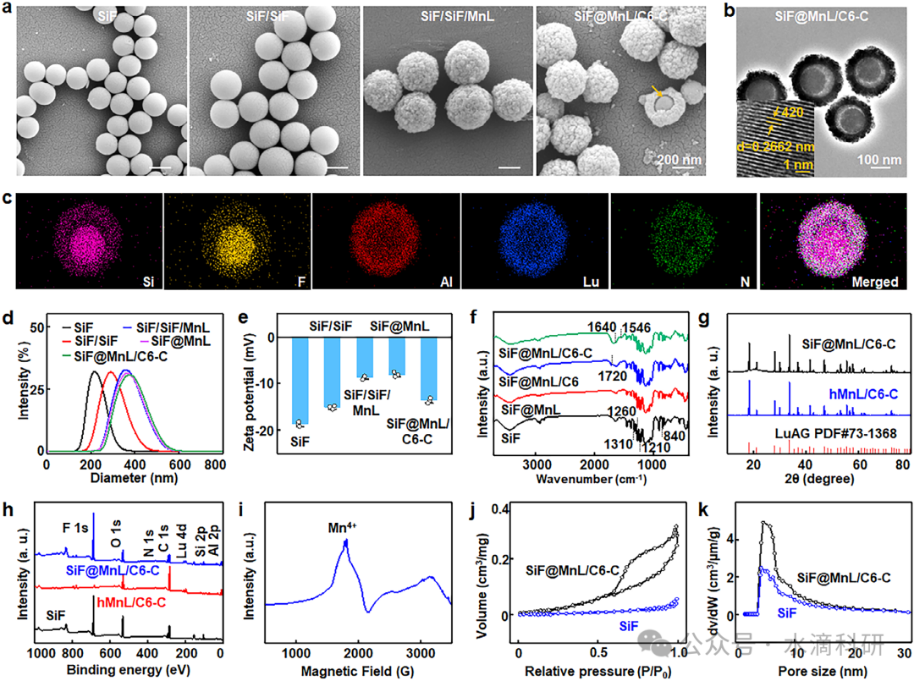 图1、(a) SiF@MnL NPs制备过程中的形态演变。(b) SiF@MnL/C6-C NPs的TEM图像,显示清晰的yolk-shell结构。(c) SiF@MnL/C6-C NPs的元素映射图像。(d) NP制备过程中的水合粒径变化。(e) SiF、SiF/SiF、SiF@MnL和SiF@MnL/C6-C NPs的Zeta电位分析。(f) SiF、SiF@MnL、SiF@MnL/C6和SiF@MnL/C6-C NPs的FTIR光谱。(g) hMnL和SiF@MnL/C6-C NPs的XRD图谱。(h) SiF、hMnL/C6-C和SiF@MnL/C6-C NPs的XPS宽扫描光谱。