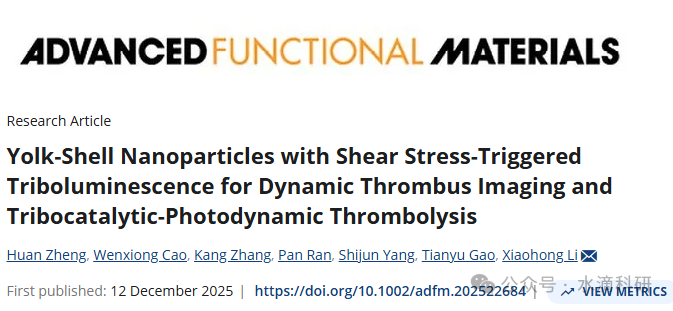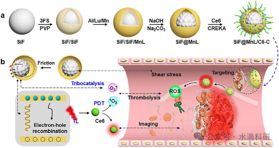 本研究成功开发了yolk-shell结构的SiF@MnL/C6-C NPs,实现了剪切应力触发的摩擦发光成像与摩擦催化-PDT协同溶栓。该策略通过内源性剪切应力激活NPs,在血栓部位产生靶向性的发光信号和高效的ROS生成,实现了血栓的实时成像和有效溶栓。碱性蚀刻优化表面粗糙度显著增强了摩擦电势,提升了发光强度和ROS生成,进一步提高了诊疗效果。
