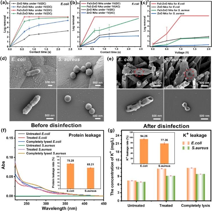 图6.Fe-ZnO NAs电极的消毒效果及细菌膜损伤评估。(a)在 1 V直流电压作用下,不同接触时间(细菌浓度为 106 CFU/ml)下 ZnO NAs、Fe1-ZnO NAs、Fe3-ZnO NAs和 Fe5-ZnO NAs电极对大肠杆菌的消毒效率;(b)在 1 V直流/交流电压作用下,不同接触时间(细菌浓度为 106 CFU/ml)下 ZnO NAs和 Fe3-ZnO NAs电极对大肠杆菌的消毒效率;(c)不同电压(0~2 V直流)下 ZnO NAs和 Fe3-ZnO NAs电极对大肠杆菌和金黄色葡萄球菌(细菌浓度为 106 CFU/ml)的消毒效率;(d)用 Fe3-ZnO NAs电极消毒前大肠杆菌和金黄色葡萄球菌的扫描电子显微镜图像;(e)用 Fe3-ZnO NAs电极消毒后大肠杆菌和金黄色葡萄球菌的扫描电子显微镜图像;(f)灭活细菌内部蛋白质的泄漏率;(g)灭活细菌中钾离子的泄漏率。