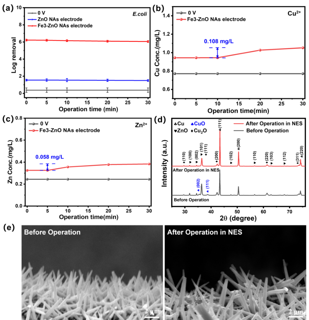 图7.电极稳定性测试及电极降解分析。(a)ZnO NAs 电极和 Fe3-ZnO NAs 电极的长期消毒性能(大肠杆菌浓度为 106 CFU/ml,1 V 直流电),(b)Fe3-ZnO NAs 电极运行 30 分钟时出水中 Cu2+ 的浓度,(c)Fe3-ZnO NAs 电极运行 30 分钟时出水中 Zn2+ 的浓度,(d)Fe3-ZnO NAs 电极运行前后的 XRD 图谱,(e)Fe3-ZnO NAs 电极运行前后的 SEM 形貌。