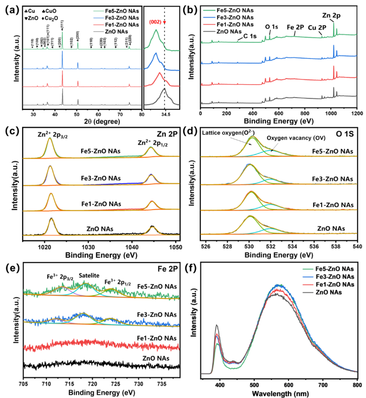 图4.ZnO NAs和 Fe-ZnO NAs的 XRD 图谱、XPS 光谱和 PL 光谱表征。(a)ZnO NAs、Fe1-ZnO NAs、Fe3-ZnO NAs和 Fe5-ZnO NAs的 XRD 图谱,图中插图为 ZnO NAs和 Fe-ZnO NAs在 34.5°处的 XRD 峰位移情况,(b)XPS 全谱,(c)Zn 2p 核级 XPS 光谱,(d)O 1S 核级 XPS 光谱,(e)Fe 2P 核级 XPS 光谱,(f)ZnO NAs、Fe1-ZnO NAs、Fe3-ZnO NAs和 Fe5-ZnO NAs的 PL 图谱。