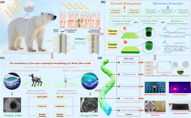 随着5G/6G通信、雷达探测和高端电子设备的快速发展,开发能够高效吸收电磁波、同时具备柔性轻质特点的新型材料,已成为电磁防护和热管理领域的迫切需求。传统材料往往难以兼顾“宽频带”“强吸收”“薄厚度”与“多功能”。受自然界北极熊毛发卓越保温性能及其独特中空结构的启发,本研究提出了一种创新的 “自由空间工程” 策略。我们巧妙地通过多轴湿法纺丝和定向干燥技术,成功制备了两种具有可编程微纳结构的石墨烯基纤维:中空纤维与气凝胶纤维。
