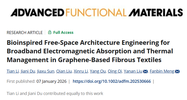 研究成果以“Bioinspired Free-Space Architecture Engineering for Broadband Electromagnetic Absorption and Thermal Management in Graphene-Based Fibrous Textiles”发表于《Advanced Functional Materials》期刊。材料学院2022级博士研究生李天为第一作者,刘亚南特聘副研究员、孟凡彬教授为通讯作者。研究工作得到了国家自然科学基金、四川省科技计划项目、中央高校基础研究等项目支持。