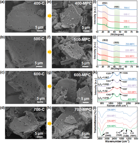 图1. 竹炭和MPC的微观结构表征:(a-d)竹炭和(e-h)MPC的SEM图像,(i)竹炭和(j)MPC的XRD图案,(k)MPC的拉曼光谱和(l)FTIR光谱。